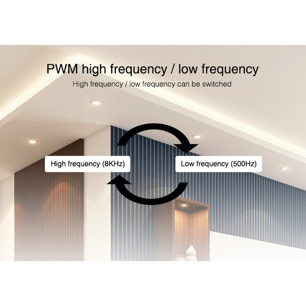 De nieuwe slimline ledstrip controllers hebben de mogelijkheid om te dimmen op de hoge PWM frequentie van 8KHz en op de lage frequentie van 500Hz.