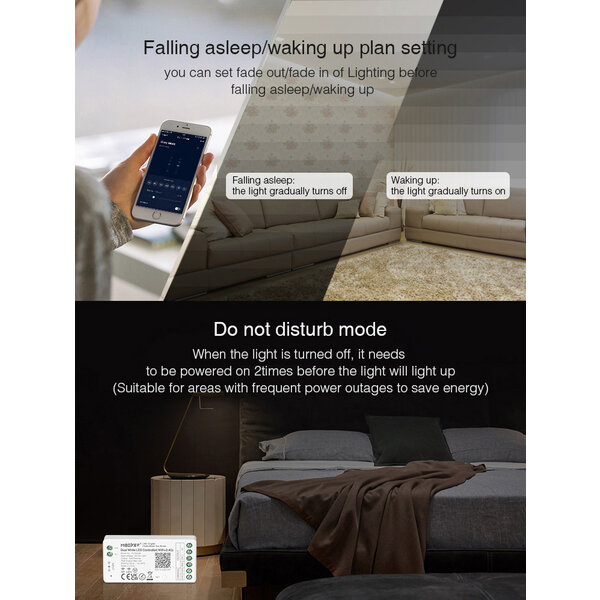 De DualWhite ledstrip controller is te bedienen via uw smartphone of tablet op het 2.4GHz WiFi netwerk. Is er door omstandigheden geen WiFi verbinding beschikbaar dan is het ook mogelijk om deze ledstrip controller te bereiken via bluetooth. Ook is het mogelijk om gebruik te maken van een fysieke afstandsbediening of wandpaneel. De ledstrip controller is compatible met onderstaande producten.