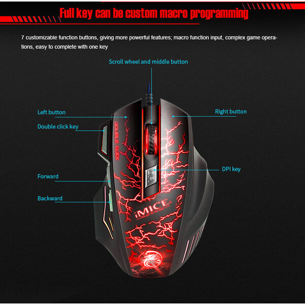 Til je game-ervaring naar een hoger niveau met deze gave game muis met RGB verlichting. Deze bedrade gamemuis met 7 knoppen is ideaal voor tijdens het gamen. De 7 knoppen passen zich aan ieder soort spel aan en zorgen voor een snelle en gevoelige bediening. Dit zorgt voor de ultieme game-ervaring. De gamemuis beschikt over een linker- en rechtermuisknop, scrollwiel, DPI knop en twee knoppen om een pagina voor- en achteruit te laten gaan. Ook is er een dubbelkliktoets, één klik worden twee kliks.