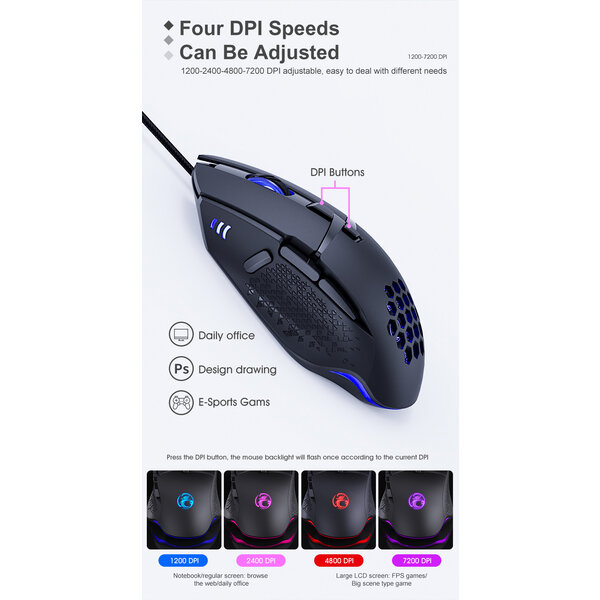 Met één druk op de knop kun je het DPI-bereik aanpassen. Deze optische technologie maakt elke klik nauwkeuriger, kostbaarder en responsiever. DPI is in te stellen in 1200/2400/4800/7200 DPI. Tijdens het gamen kun je het DPI-bereik omhoog en omlaag zetten. Wil je een moeilijke sniper shot nemen, dan kun je je DPI omlaag brengen. Je kunt ook direct weer je DPI omhoog stellen voor bijvoorbeeld een supersnelle flick. Ideaal! De standaard is 1200 DPI. Aan de kleur van de verlichting kun je zien wat de DPI is: