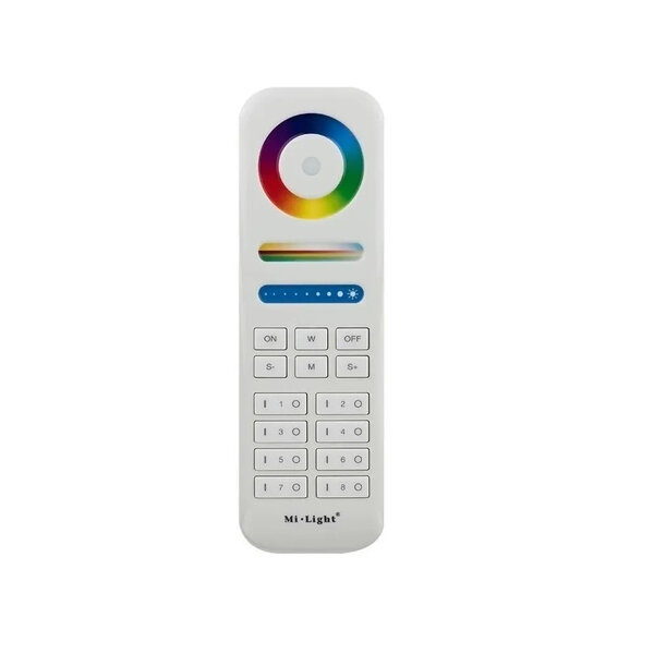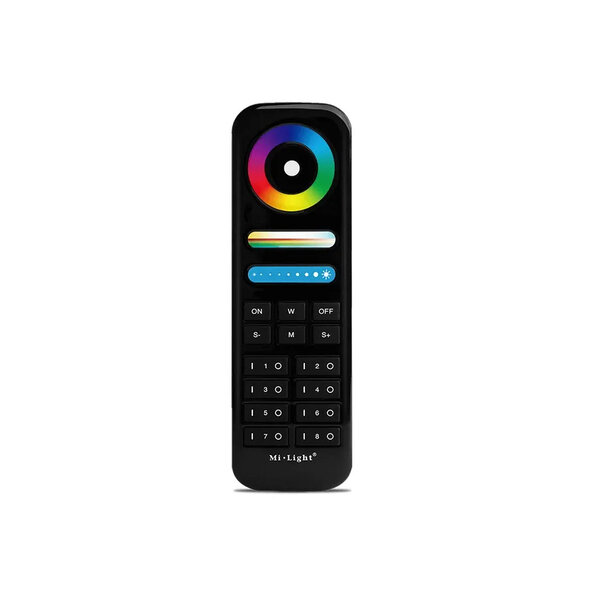 Met deze gloednieuwe afstandsbediening van Mi-Light bedient u tot wel 8 verschillende zones tegelijkertijd of apart van elkaar. Via 2.4G (Radio Frequentie) kan u tot een afstand van 30 meter de gekoppelde controllers bedienen. De remote werkt volledig op touch (aanraking) en ligt erg prettig in de hand. Naast het stijlvolle slanke design van de controller is deze dus ook erg makkelijk in gebruik.