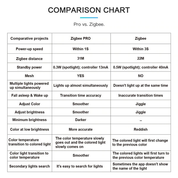 Al onze GLEDOPTO Zigbee 3.0 lampen en spots zijn van de PRO serie. De PRO series brengen een groot aantal voordelen met zich mee. Zo starten ze sneller op bij het inschakelen, hebben een groter bereik en zijn de kleuren verfijnder in te stellen. De complete vergelijking van deze specificaties staat als laatste afbeelding weergegeven.